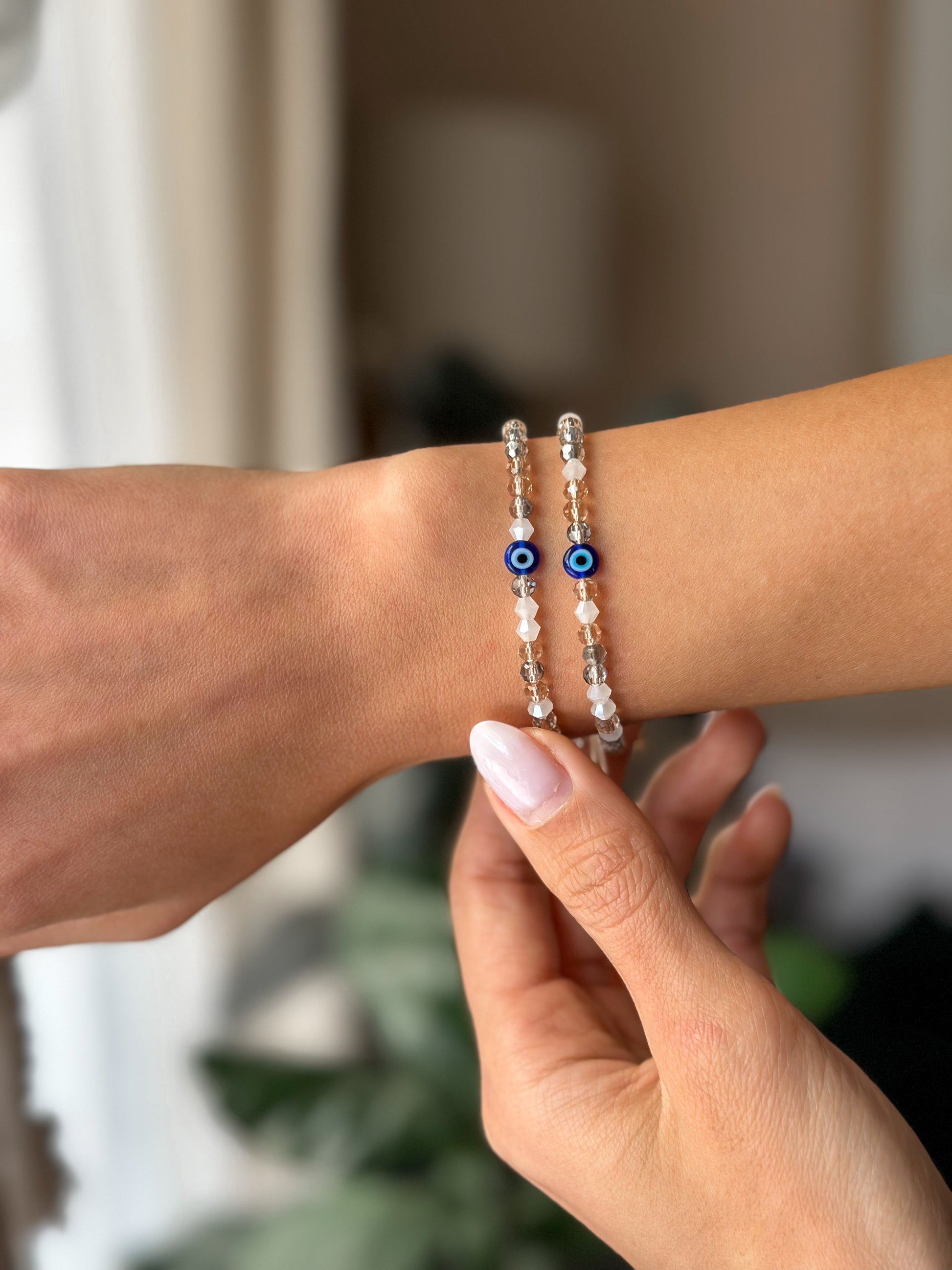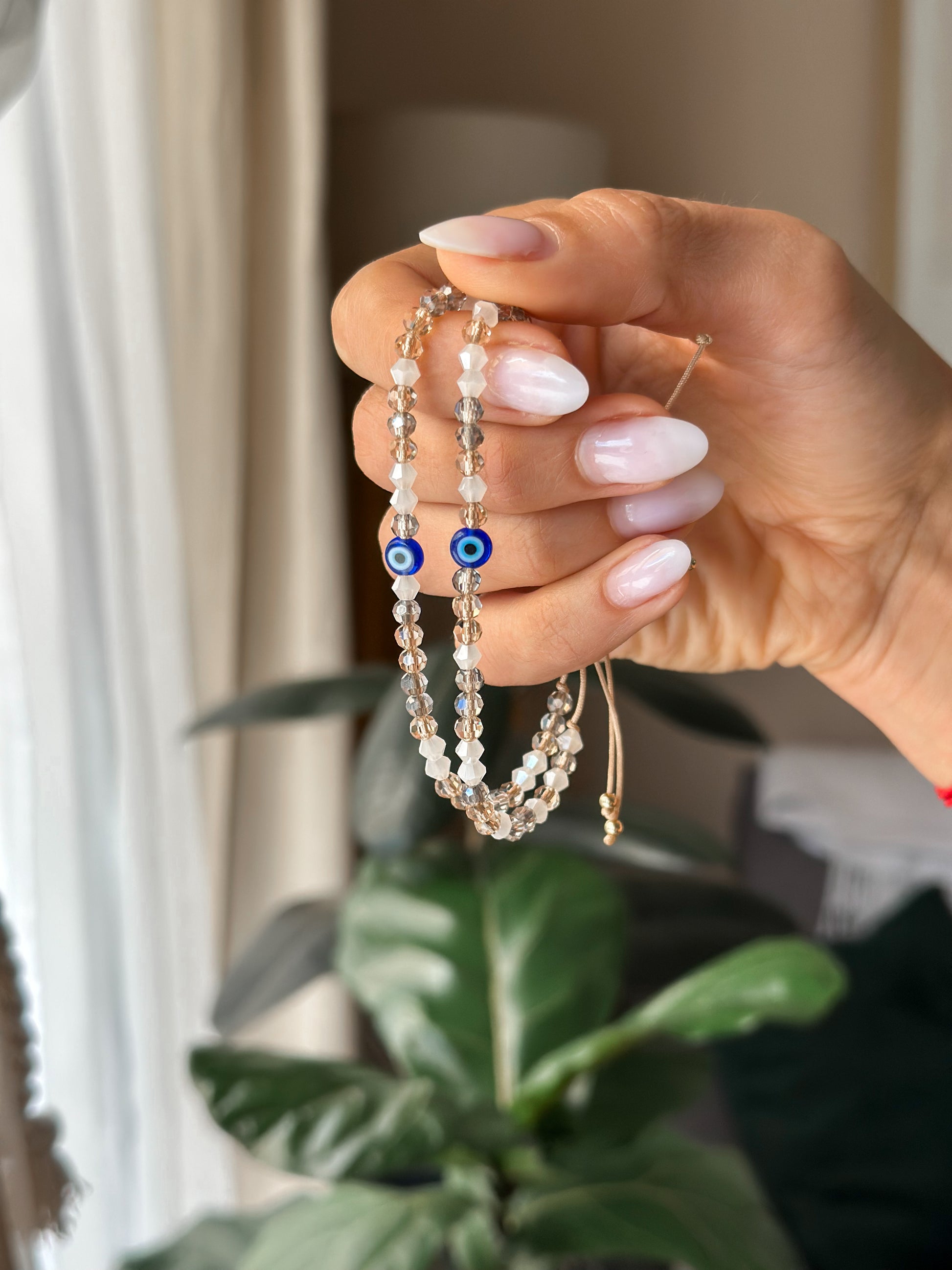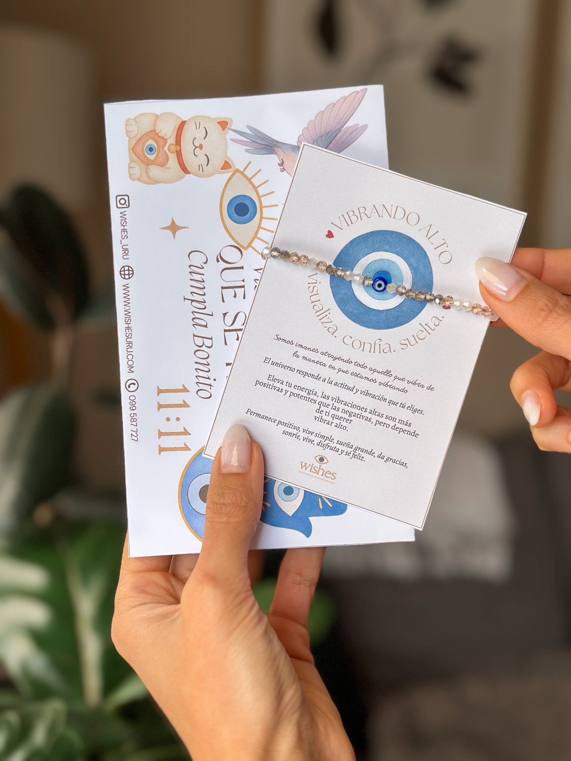 Un amuleto que combina la claridad del cristal con la protección del ojo azul. Sus reflejos delicados iluminan tu energía y te recuerdan que todo lo que vibra en luz se potencia. Es suave, elegante y delicada