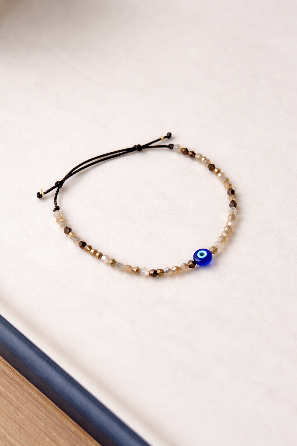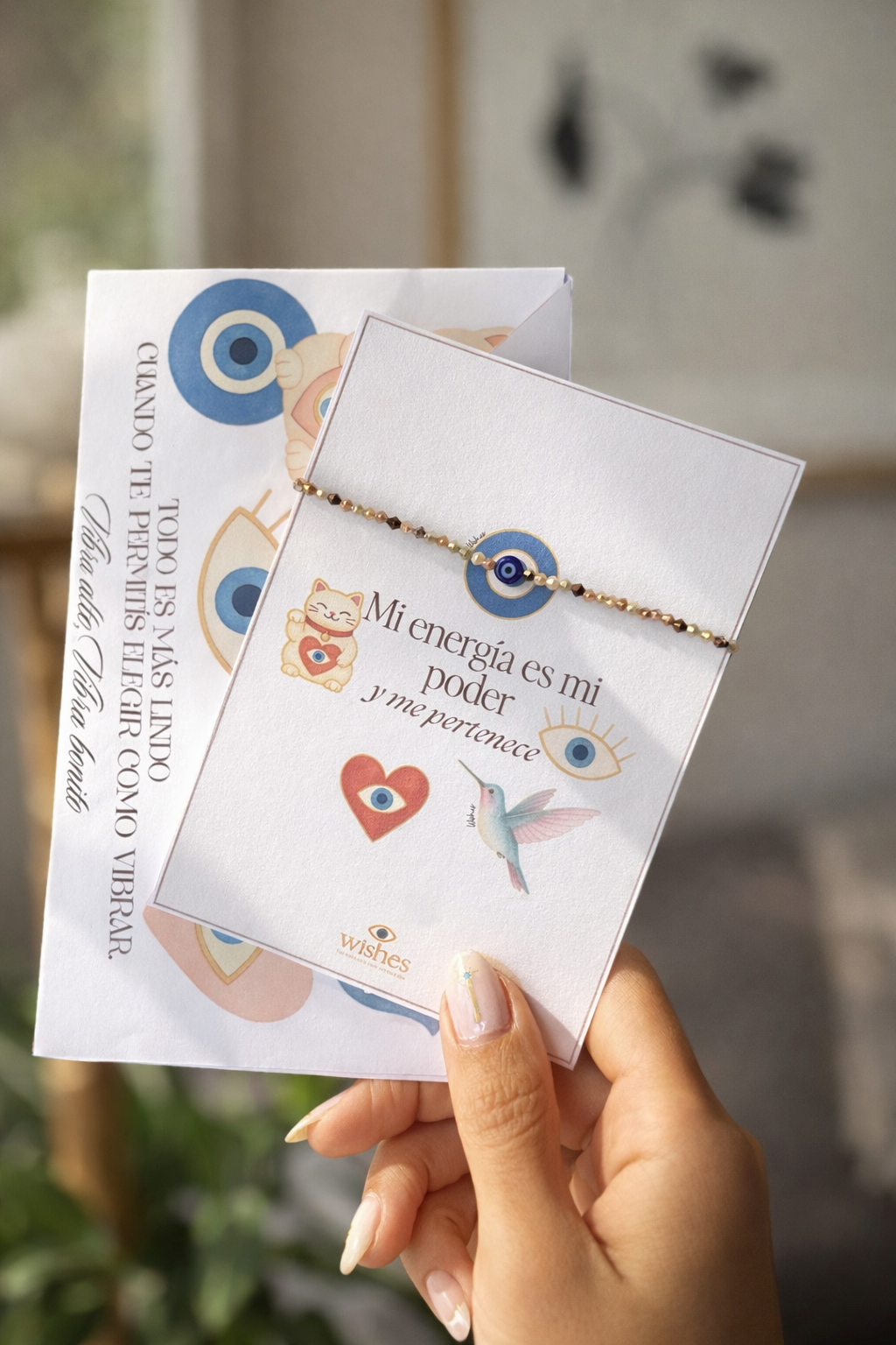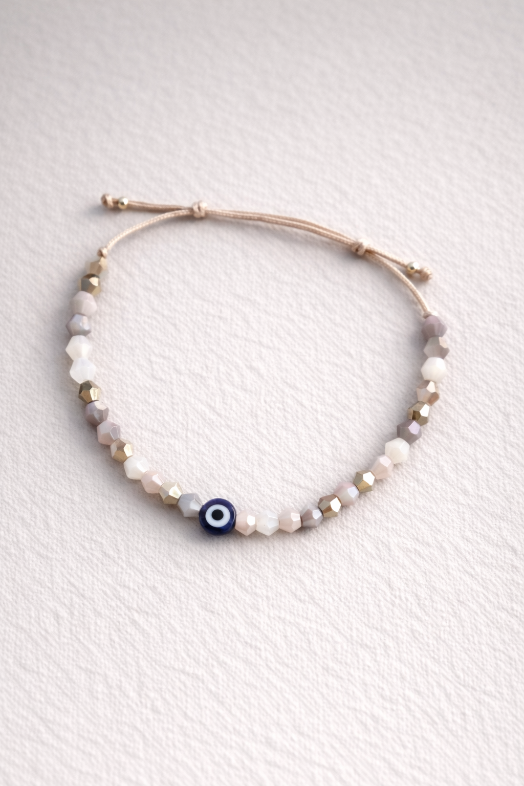 Un amuleto que combina la claridad del cristal con la protección del ojo azul. Sus reflejos delicados iluminan tu energía y te recuerdan que todo lo que vibra en luz se potencia. Es suave, elegante y delicada