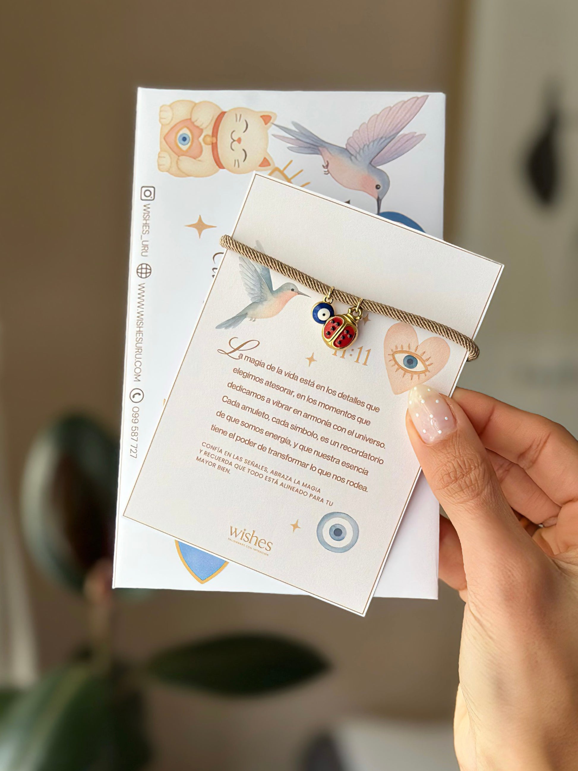 La mariquita es símbolo universal de suerte y buena fortuna, potenciada por la energía protectora del ojo turco. Un imán de cosas bonitas.