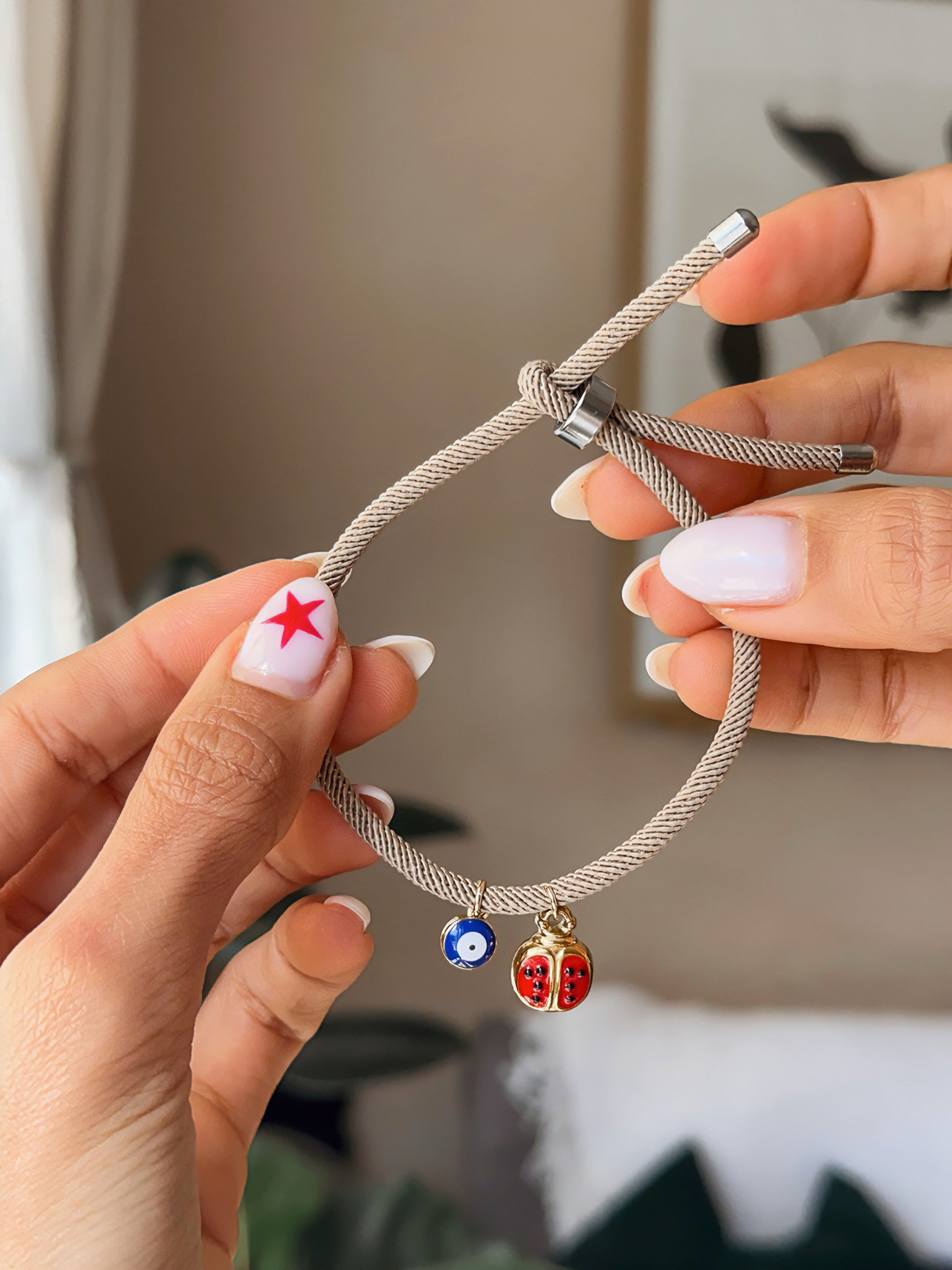 Pulsera beige con dije de Ojo Turco y mariquita roja.