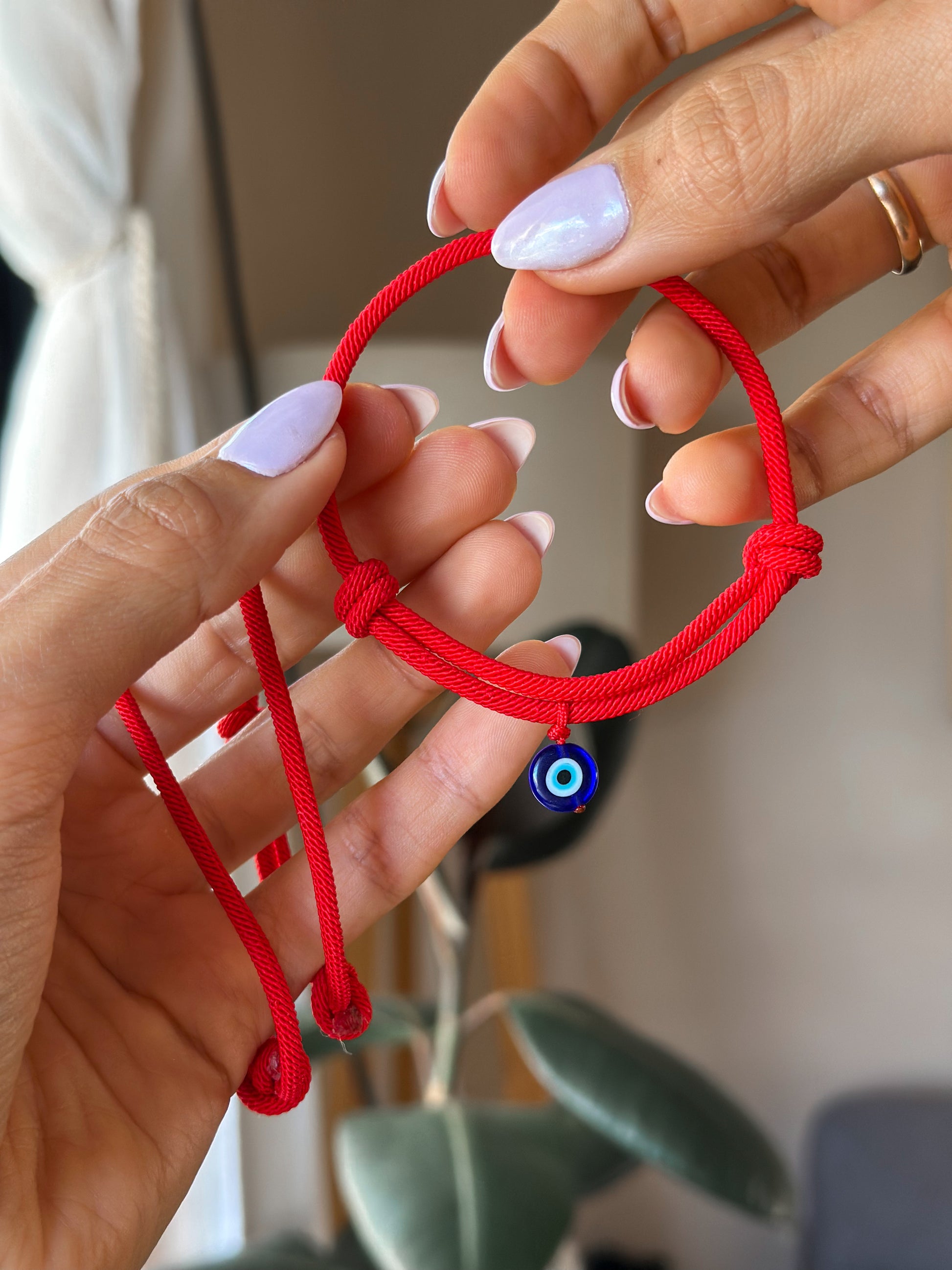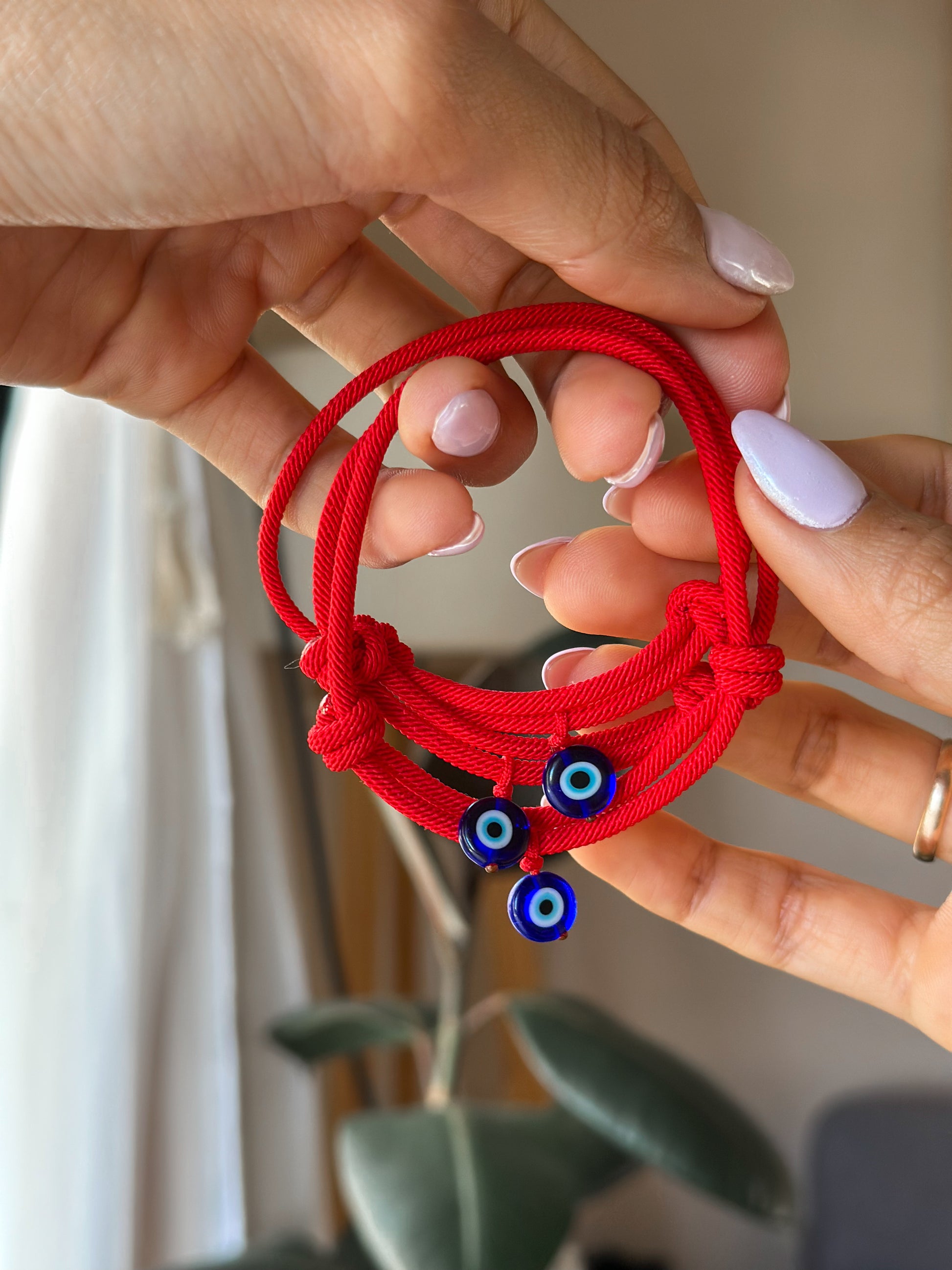 La combinación del hilo rojo + ojo turco crea un campo protector que bloquea envidias, repele malas vibras y equilibra tu energía para que te sientas más liviano , seguro y conectado con vos