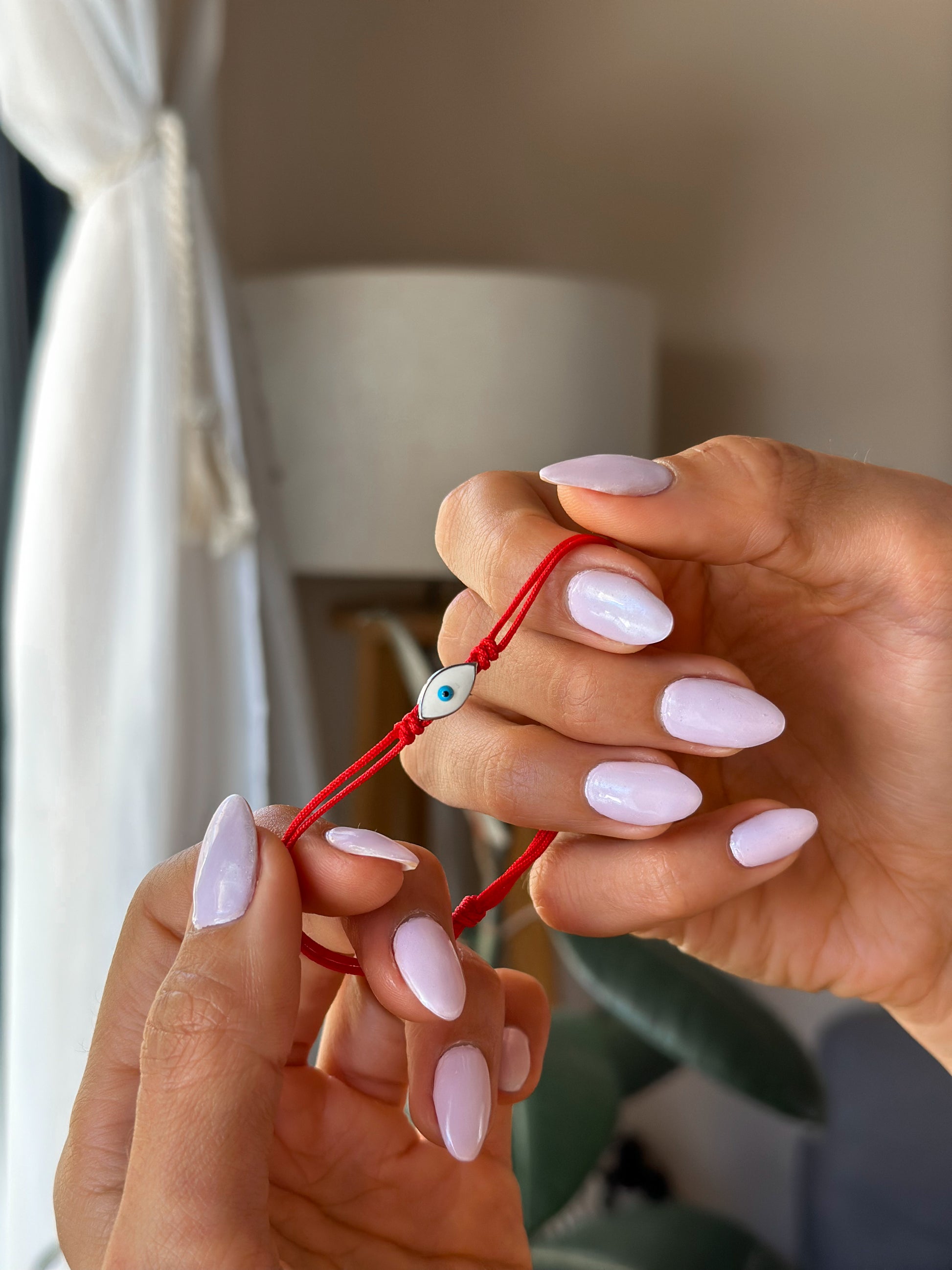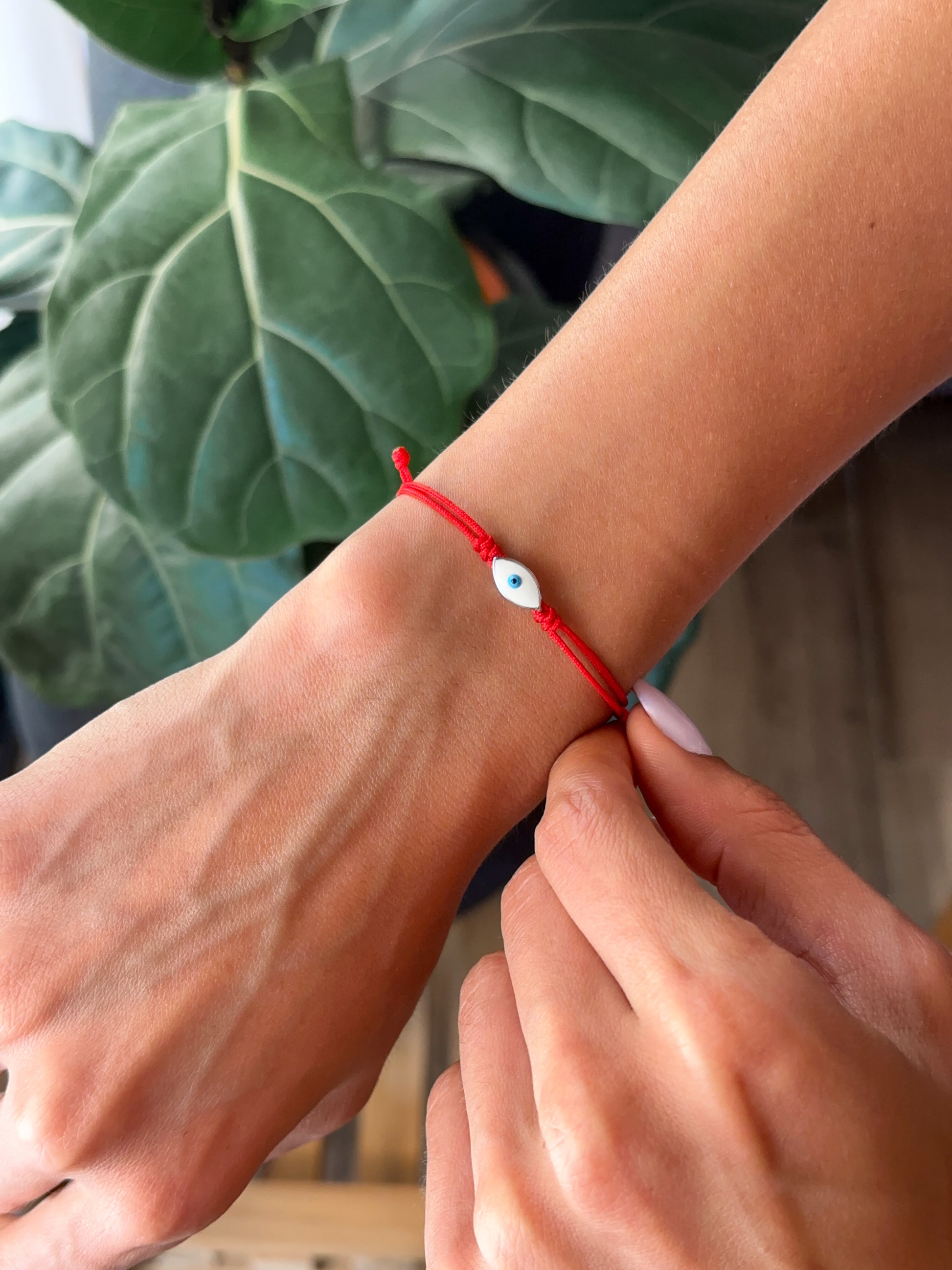 La combinación del hilo rojo con este ojo de protección alargado crea un escudo energético que cuida tu vibra y te mantiene alineada.