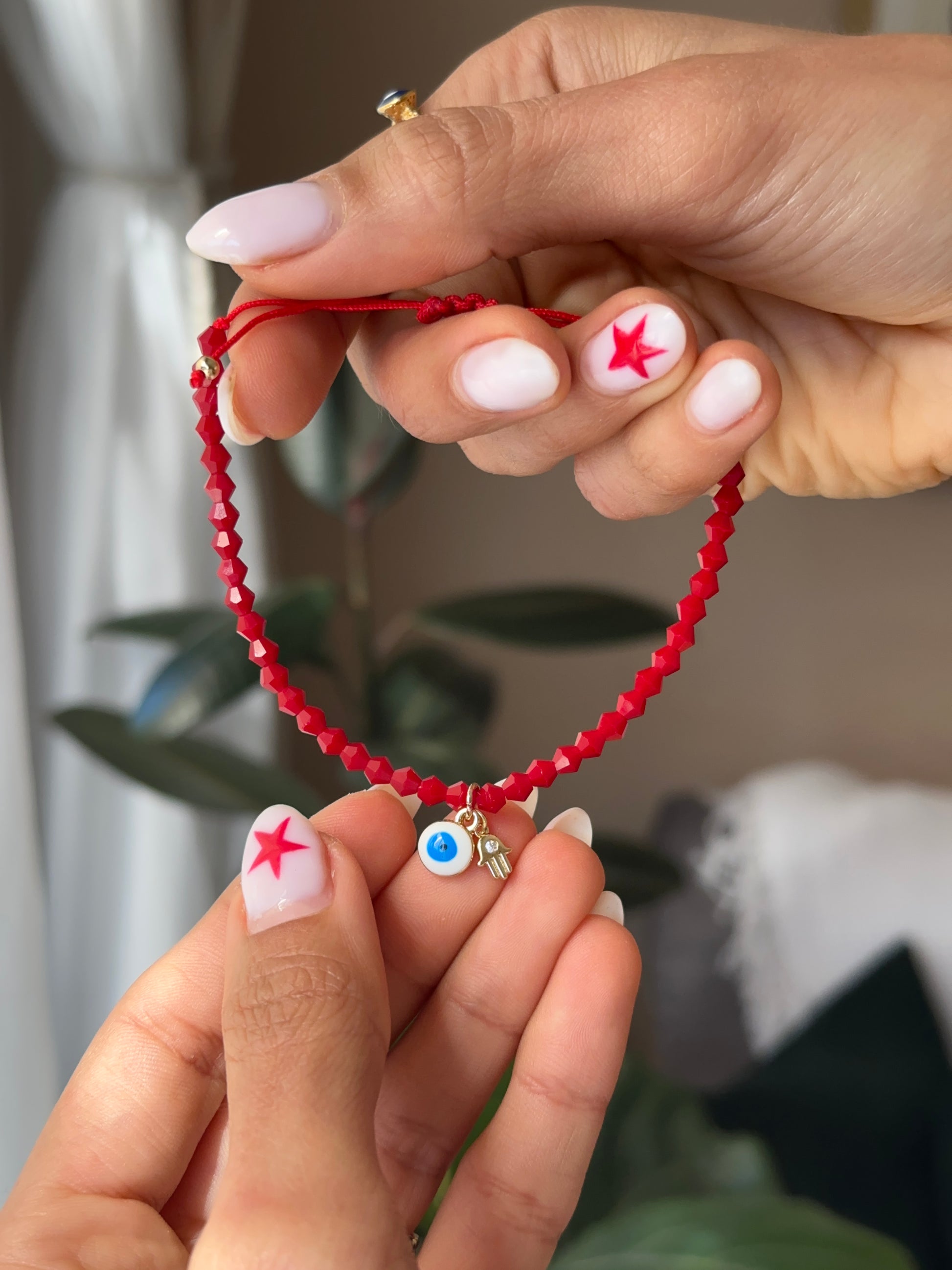 Pulsera roja facetada con dije de Ojo Turco y Mano Hamsa.