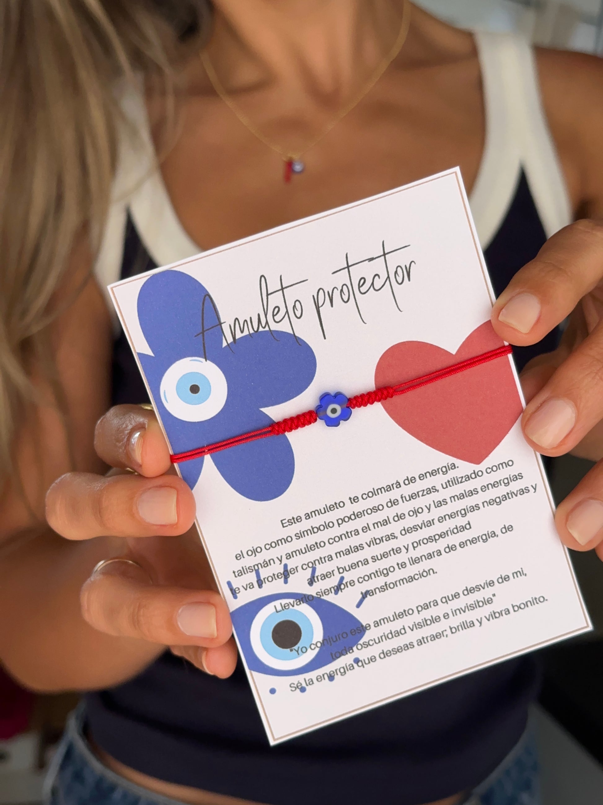 amuleto poderoso que te protege de las malas vibras, atrae buena suerte y te mantiene alineado con las energías positivas. 🙌✨ Combina la fuerza protectora del Ojo Turco en forma de flor con el poder del hilo rojo para estar siempre rodeado de buenas vibras. 🌸✌🏼💙